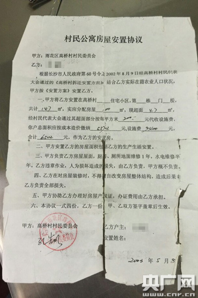 村民陳女士告訴記者,1998年開始,坐落于雨花區(qū)的高橋村成了城市擴(kuò)容點(diǎn),按照規(guī)劃,這里是“湖南省最大的市場(chǎng)群”以及城市交通樞紐,村民的家隨后被拆遷。拆遷后他們先是在一個(gè)臨時(shí)安置點(diǎn)居住,2004年搬進(jìn)了新建的“安置房”,直到今天,還沒有拿到任何權(quán)證!2004年,給我們住的安置房,到了現(xiàn)在,12年了,我們一直都沒有任何權(quán)證,而且這種房子還是違法建筑!标惻空f。