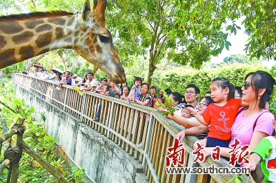 28日,深圳野生動(dòng)物園里的長(zhǎng)頸鹿吸引眾多游客駐足觀賞。記者 朱洪波 攝