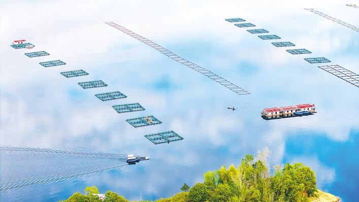 10月24日,在黃岡市白蓮河水庫水域,一個個水產(chǎn)養(yǎng)殖網(wǎng)箱整齊排布,養(yǎng)殖戶駕船在網(wǎng)箱區(qū)域忙碌,呈現(xiàn)出一幅生態(tài)養(yǎng)殖與碧水藍(lán)天相融的現(xiàn)代農(nóng)業(yè)圖景。
