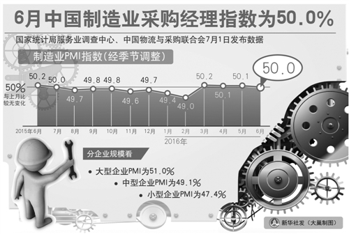 今天上午,國家統(tǒng)計局發(fā)布了今年6月份中國制造業(yè)采購經(jīng)理人指數(shù)PMI數(shù)值為50.0%,比上月微降0.1個百分點(diǎn),位于臨界點(diǎn)。