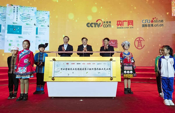 2018年12月23日下午,中央廣播電視總臺、教育部、國家語委聯合舉辦“中小學語文示范誦讀庫”第二季作品發(fā)布會。中宣部副部長、中央廣播電視總臺臺長慎海雄,教育部副部長、國家語委主任杜占元,中央廣播電視總臺副臺長閻曉明出席發(fā)布會,并共同見證第二批100篇音頻教材正式上線發(fā)布。 新華社記者沈伯韓 攝