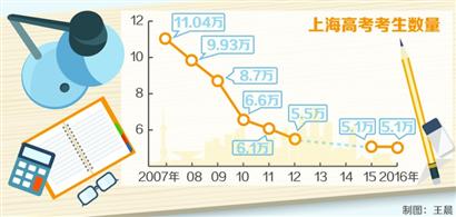 統(tǒng)計(jì)數(shù)據(jù)顯示,近幾年來,上海每年6月高考人數(shù)總體呈下降趨勢。2007年考生數(shù)量為11.04萬;2015年,本市高考考生數(shù)量為5.1萬。業(yè)內(nèi)專家分析,考生人數(shù)變動(dòng)的主要原因是適齡入學(xué)人口總量減少。就在幾年前,曾有預(yù)測,上海高考人數(shù)將在2016年、2017年間迎來回升。對于這樣的說法,專家并不認(rèn)同。從上海高中入學(xué)情況來看,近三年數(shù)字保持平穩(wěn),并未出現(xiàn)較大波動(dòng)。