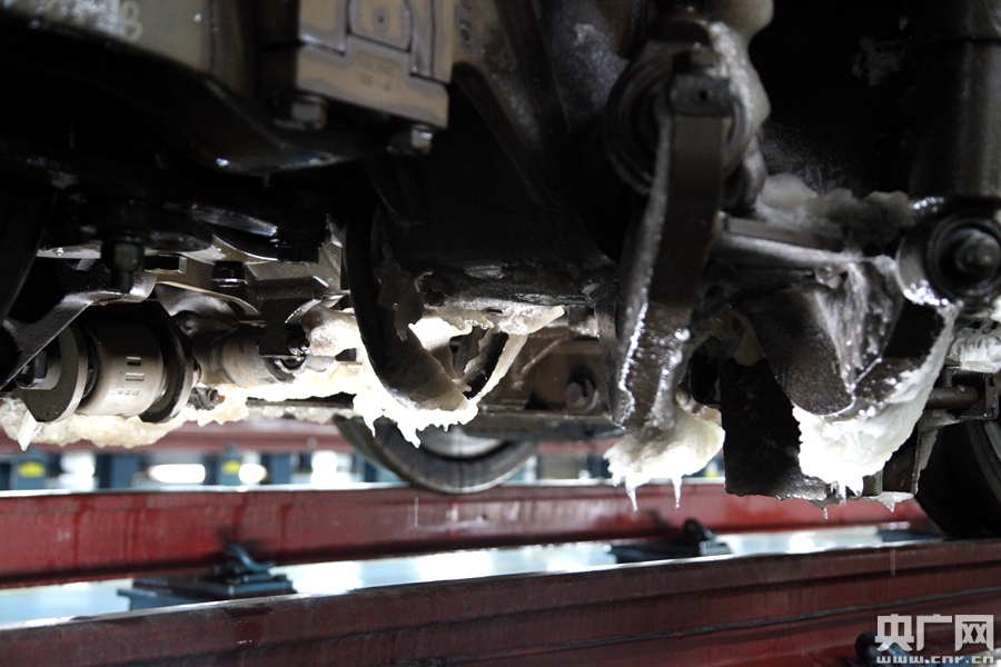 北京鐵路局動車段配屬動車組車底結(jié)冰情況。(央廣網(wǎng)發(fā) 李博攝) -