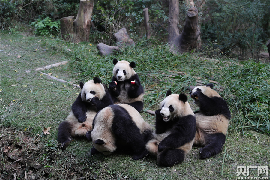 大熊貓?jiān)诔灾褡樱ㄑ霃V網(wǎng)發(fā) 成都熊貓基地供圖)