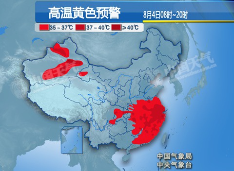 中央氣象臺(tái)預(yù)計(jì),未來(lái)三天,受副熱帶高壓影響,黃淮南部、江淮、江漢、江南大部、華南東部及四川盆地東部等地將有35℃以上的高溫天氣,部分地區(qū)最高氣溫37~39℃,期間受冷空氣影響,5日開(kāi)始,四川盆地東部和黃淮南部的高溫減弱。另外,新疆南疆盆地、吐魯番盆地和準(zhǔn)噶爾盆地南部等地有35℃以上的高溫天氣,部分地區(qū)最高氣溫37~39℃,吐魯番盆地可達(dá)40~42℃。為此,中央氣象臺(tái)8月4日06時(shí)繼續(xù)發(fā)布高溫黃色預(yù)警。