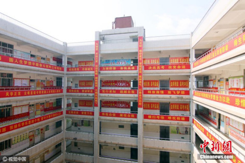 2016年3月26日,湖北省襄陽市,一所高級中學(xué)沖刺高考的正能量勵志橫幅掛滿校園。圖片來源:視覺中國