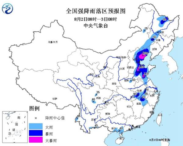 中央氣象臺預(yù)計,8月2日8時至3日8時,江西東北部、湖北東北部、安徽南部、江蘇北部、山東中西部、河北東部、北京東部、天津、遼寧西部、內(nèi)蒙古東南部、吉林西部以及黑龍江中部、云南南部等地的部分地區(qū)有大雨或暴雨,局地有大暴雨(100~180毫米),最大小時雨強可達70毫米。為此,中央氣象臺繼續(xù)發(fā)布暴雨藍色預(yù)警。