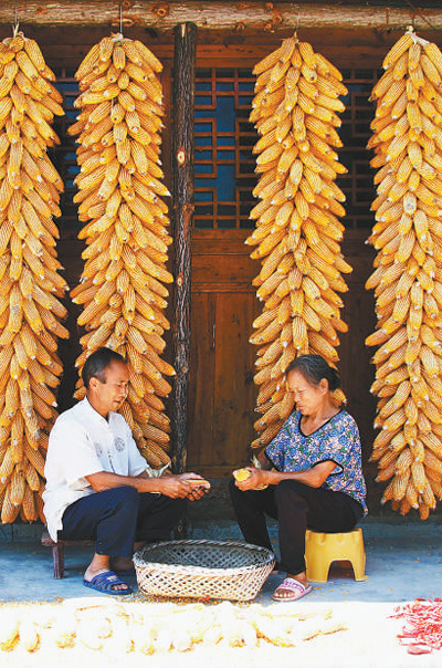 9月13日,貴州省銅仁市印江土家族苗族自治縣新寨鎮(zhèn)泗塘村農(nóng)民正在給豐收的玉米脫粒。 左禹華攝(影像中國(guó))