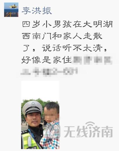 隨后,民警將孩子的照片發(fā)到朋友圈尋求大家的轉(zhuǎn)發(fā),并通過交通廣播和大明湖景區(qū)廣播尋找孩子的家長。家人聽到廣播后,立即找到了景區(qū)工作人員。最終,民警在與大明湖景區(qū)工作人員的共同努力下,僅用了大約半個(gè)小時(shí)就與孩子的家長取得聯(lián)系。在落實(shí)家長的身份后,最終幫孩子找到家長。