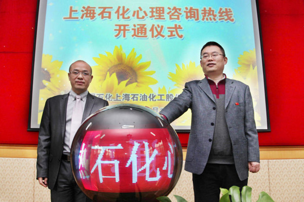 上海石化黨委書記高金平與EAP項(xiàng)目合作商負(fù)責(zé)人鄭華輝共同按下啟動(dòng)球,正式開通上海石化心理咨詢熱線。