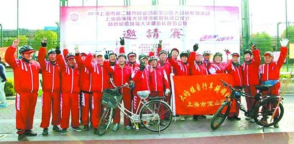 圖片說(shuō)明:大場(chǎng)鎮(zhèn)自行車(chē)騎游隊(duì)參加市民運(yùn)動(dòng)會(huì)時(shí)合影