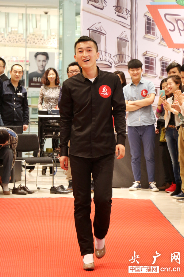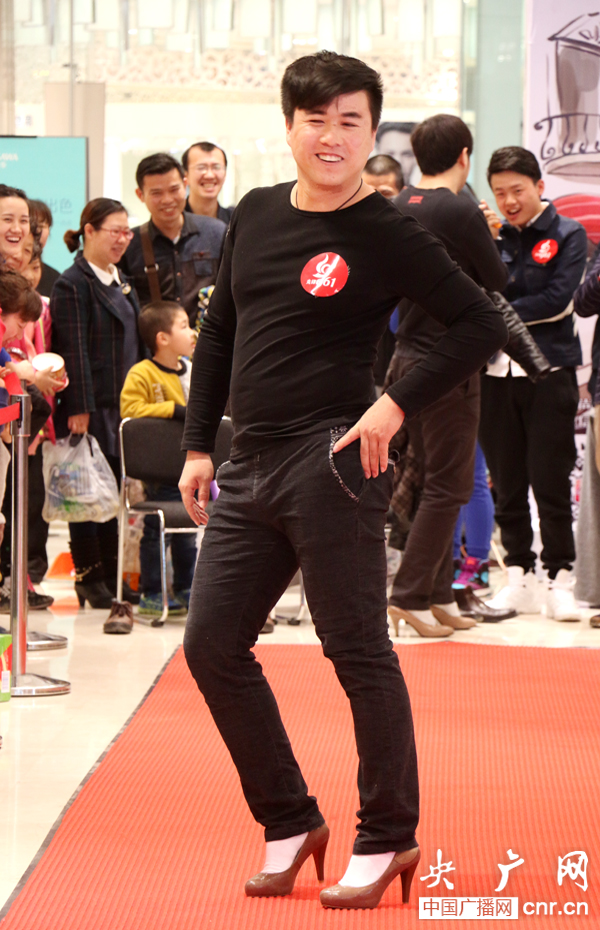 穿著高跟鞋走“貓步” 這小伙兒有點(diǎn)害羞 趙敏 攝